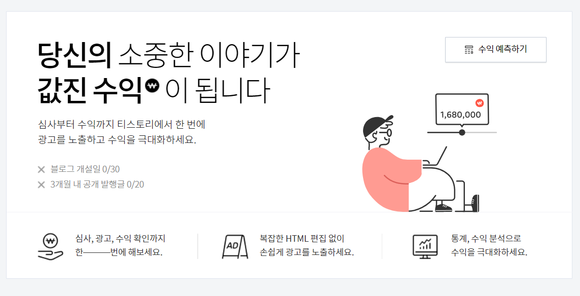 하지만 블로그 개설일 30일을 채워야하고, 3개월 내 공개 발행글 20개를 채워야 하네^^