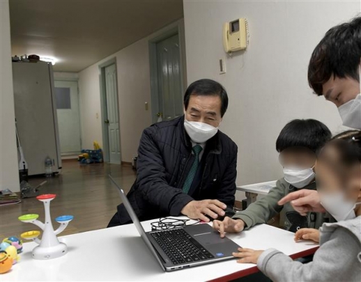 코로나19로 인한 디지털 교육 격차를 없애기 위해 다양한 정책을 펼치는 문석진(왼쪽) 서울 서대문구청장이 한 저소득층 가정을 방문해 어린이에게 노트북을 전달하고 직접 사용법을 알려주고 있다. 서대문구 제공