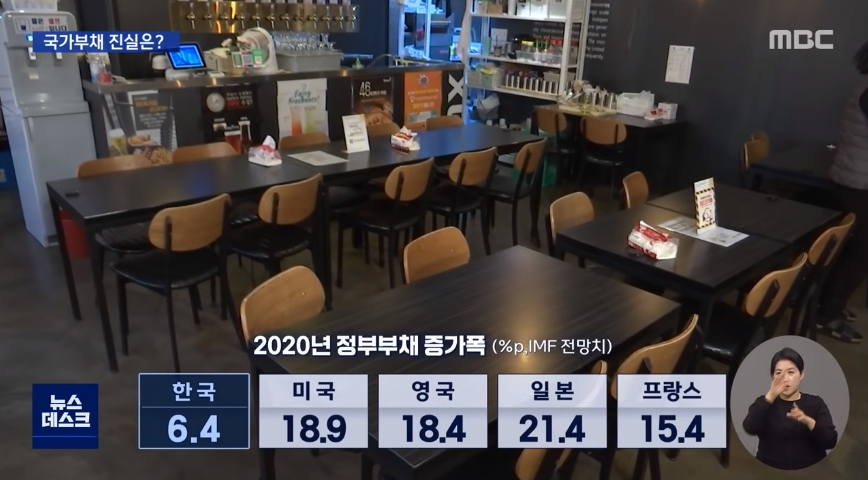 코로나19가 덮친 2020년 한국의 GDP 대비 정부 부채는 6.4%p 증가했는데, 주요 선진국들 중에 가장 낮은 수준입니다.