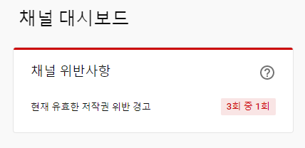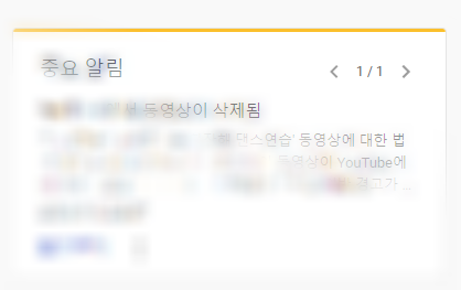 바로 저작권 위반 경고인데요. 제가 편집한 영상의 저작권 소유주로부터 동영상에 대한 저작권 침해 신고로 영상이 삭제가 되었습니다. 그리고 유튜브 스튜디오 첫 화면에 채널 위반사항이라고 뜨더라구요. 위반사항은 이메일과 계정으로 알림이 발생됩니다. 현재 유효한 저작권 위반 경고 3회 중 1회라고 뜨네요. 하... 이걸 보는 순간 어떻게 대처해야할지 막막했어요. 뭐 만든지 얼마 안되긴 했지만 굉장히 아쉽더라구요. 그리고 위반 경고가 3회가 되는 순간 구글계정에 속한 모든 채널이 삭제되고, 구글 계정도 사용 못하게 된다고 합니다. 참으로 무섭죠? 그러니 제가 열심히 저작권에 대하여 읽어보게 되더라구요.