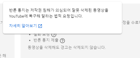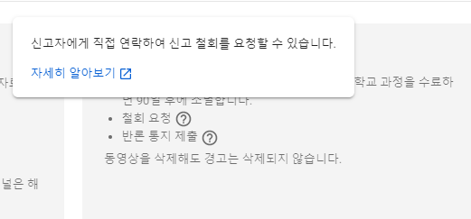 저작권 위반사항에 대하여 취할 수 있는 조치라는 내용이 있더라구요. 근데 여기서 제가 할 수 있는건 철회 요청 밖에 없더라구요. 물론 저작권 학교 과정은 수료했습니다. 안 할 수가 없었어요. 수료 후에도 바로 사라지지 않는 경고를 없애기 위해 철최 요청 옆에 물음표 표시를 누르니 "신고자에게 직접 연락하여 신고 철회를 요청할 수 있습니다." 라고 나오더라구요. 제가 봤을때는 이게 가장 확실한 방법이라고 생각했습니다. 그래서 자세히 알아보기를 눌러서 동영상 저작권 소유주님과 연락을 하게 되었습니다.