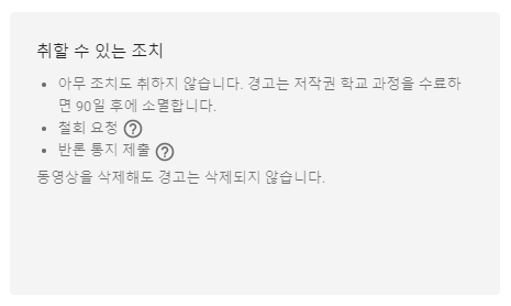 처음에는 저작권 교육을 이수하면 경고가 90일뒤에 해지 된다고 하더라구요. 근데 저는 90일 동안 저 경고를 볼 자신이 없었어요. 그래서 다른 방법을 알아보았습니다. 바로 채널 위반사항에 대하여 취할 수 있는 조치에 대한 내용인데요.